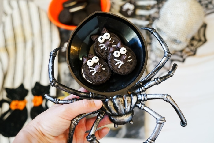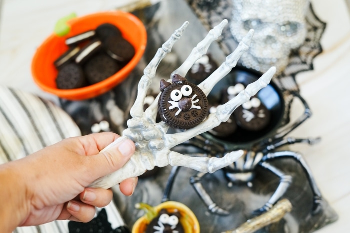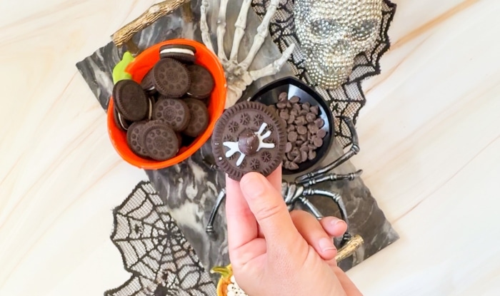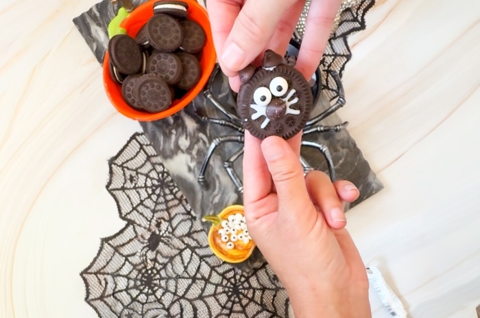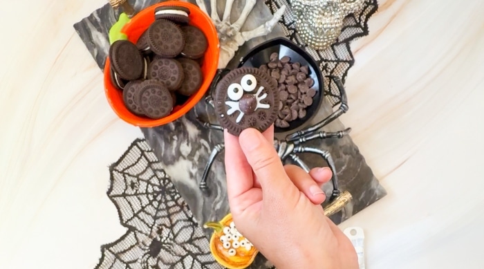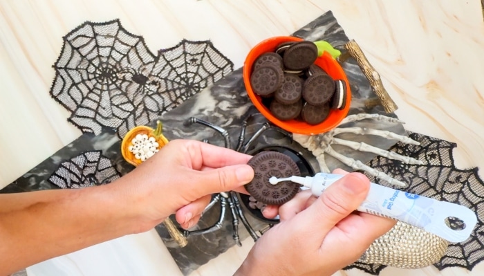 The white icing is going to be used to “glue” the eyes onto the Oreo. Add two dots for the eyes. Then place the candy eyes on each of the dots.